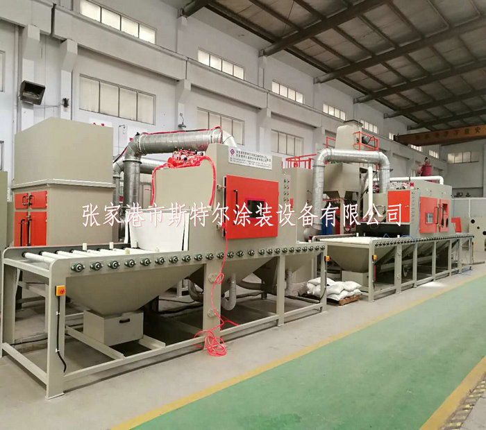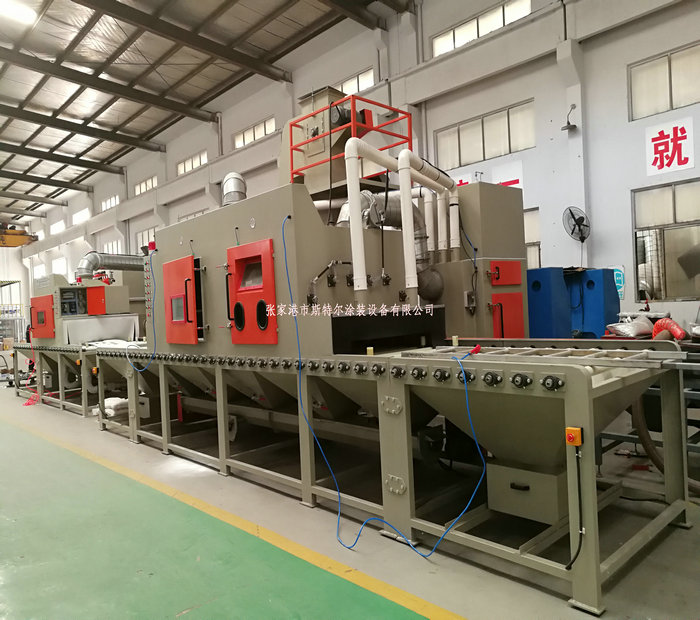 工人只操作噴砂機的控制系統和裝卸工件(或由上下工序的噴砂機的輸送機構輸入或者輸出),需要噴砂的工件放置在噴砂機的輸送機構上會自動運行經過吹氣倉后在通過噴砂工作倉進行表面噴砂處理,表面達到一定的粗糙度及達到除油,除污垢的最終效果,噴砂機加工結束后在經過除塵倉及吹氣倉,最終經過噴砂機的輸送機構運送出來。即噴砂加工結束。經過人工識別檢測后搬離,如工件上面有殘留的砂粒及粉塵時由人工使用吹氣槍清理結束后搬離。一般在噴砂機的一端出口會設計吹氣風刀,達到粉塵及砂料95%以上清除干凈。但是有可能殘留在死角及內孔里的砂料,在這種情況下只有靠人工清理,才可以全部清理結束。 加工制作依次下面: